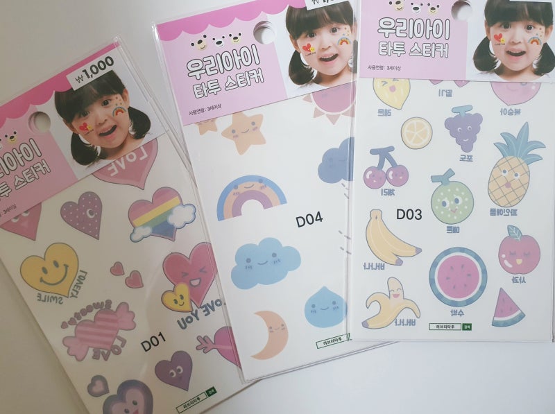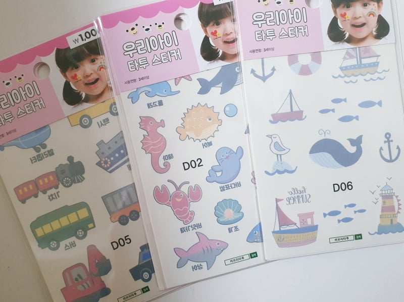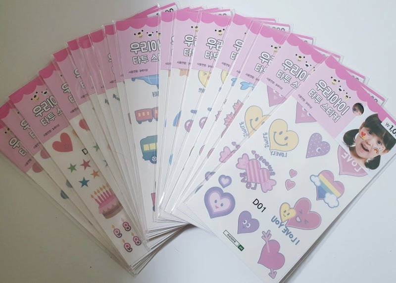 타투스티커를 아시나요? ? 예전에 풍선껌과 사탕에 있던 레플리카에요 ㅎㅎ 아주 얇아서 물을 뿌리고 조심히 붙입니다. 예전에는 한장씩 붙여야했는데 아직도 타투스티커는 활동하는곳에서 쓰더라구요 여름에는 아이들 데리고 수영장이나 놀이공원 머리띠나 풍선으로. 필요없어요 ㅎㅎ 지난 할로윈때 하나로 근처 아이들과 신나게 놀았답니다. 아이들이 정말 좋아하는 작은 타투스티커입니다.