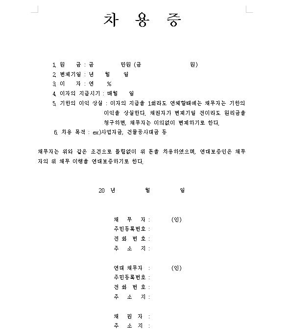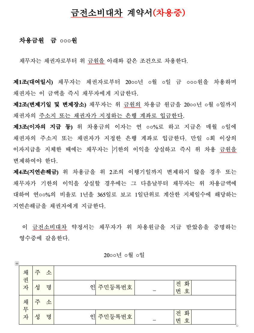 IOU 1. 차용 날짜: 2022년 00월 00일. 대출금액 : 1억원 금(100,000,000) 3. 차입목적 : 운영목적/주택구입자금 등 위 금액은 2022년 10월 00일에 차입한 금액이며, 구체적인 시행은 다음과 같습니다. 4. 이자율: 연 00%5. 이자지급일 : (매월 00일/이자지급일) 6. 상환방법 : 송금(00은행/000-000-00-000 계좌주 000) 7. 납부일 : 00:00, 2022, 00:00 8. 상환방법 : (영업이익/주택매매 등) 9. 기한상실특약 : 다음의 경우 채무자는 기한상 이익을 상실하고 1(00)%의 가산수수료를 부담하여야 함 집행, 파산 등으로 이자지급(0배) 이상 연체한 경우 연체이자의 상실로 인하여 채무자는 만기일 이전에 이의 없이 남은 채무를 모두 변제하기로 약정하고, 상기 채권자의 권리에 대한 소송은 다음을 관할하는 법원에서 합니다. 채권자의 주소. .채권자명 : 000인(인/서명/현수막) 주민등록번호: 주소: 전화번호: 채무자 성명: 000인(인/서명/서명) 주민등록번호: 주소: 전화번호: 확인서류: 등본 /summary 각 버킷에 대한 복제본이 유지됩니다. 2022년 00월 00일
