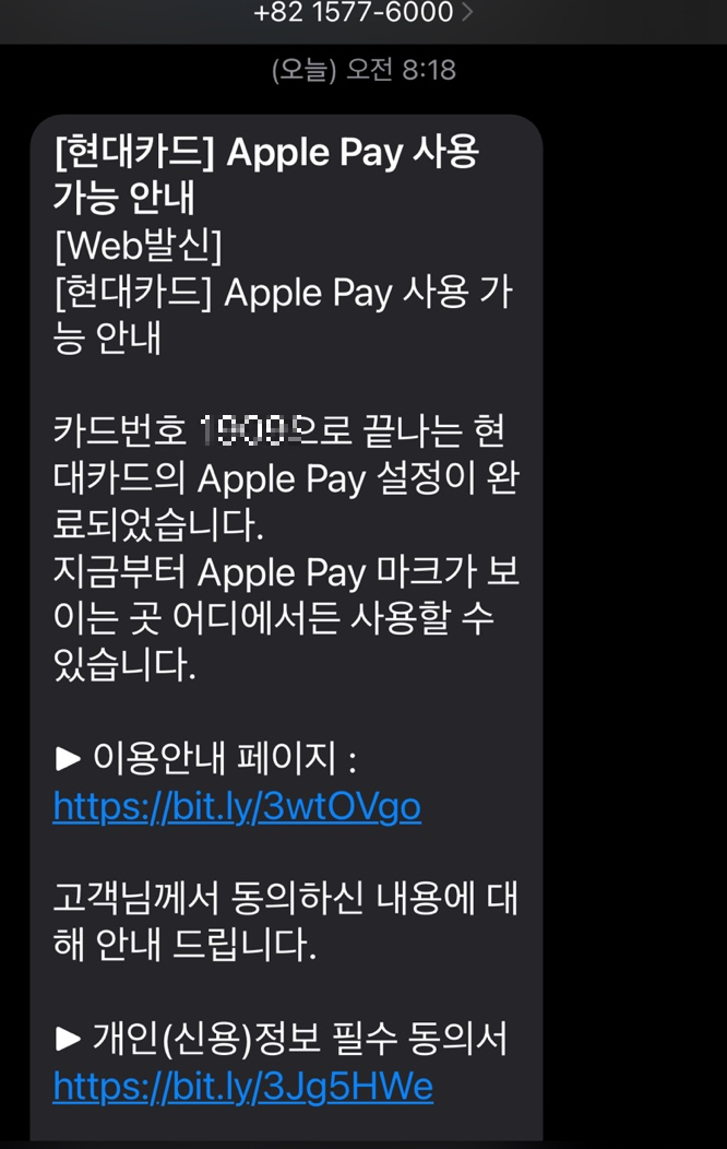 Apple Pay 등록 후 고객 휴대폰으로 “Apple Pay 활성화됨” 문자를 수신한 후 아래와 같이 결제가 가능해집니다.