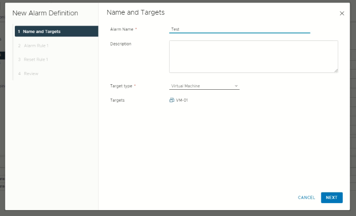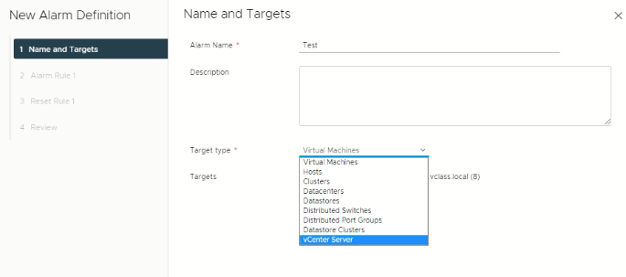 특정 가상 머신을 지정하여 알람을 추가할 때 대상 유형이 지정됩니다.